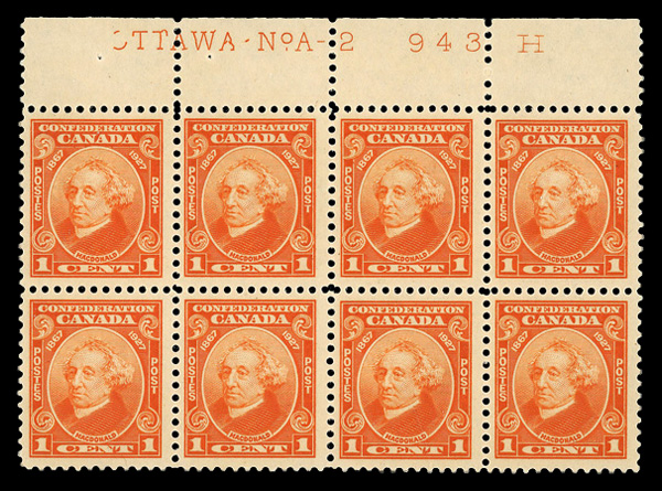 7679 nhbl 141 image1927, 1¢ Confederation (Scott 141), plate block of 8, o.g., never hinged, Very Fine to Extremely Fine.