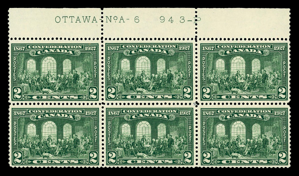 7680 nhbl 142 image1927, 2¢ Confederation (Scott 142), plate block of 6, o.g., never hinged, Very Fine to Extremely Fine.