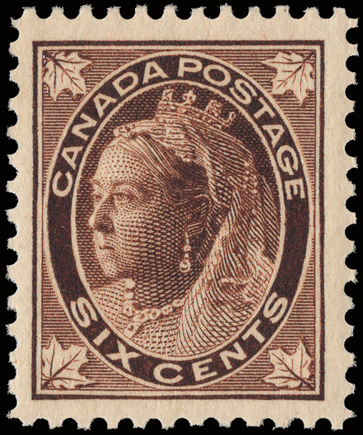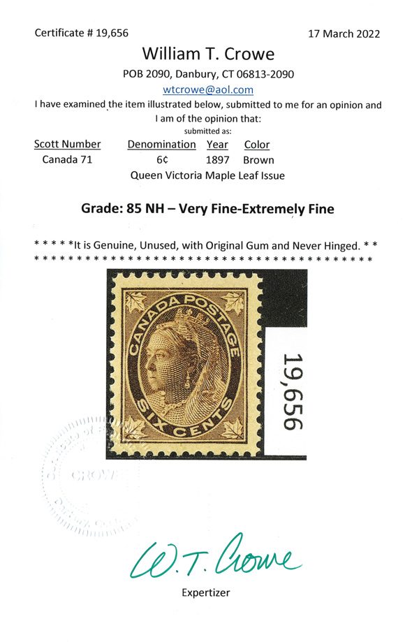 7655 nh 71 image1897, Queen Victoria "Maple Leaf", 6¢ brown (Scott 71), o.g., never hinged, fresh and very well centered, Very Fine to Extremely Fine, with a 2022 Crowe certificate graded VF-XF 85.