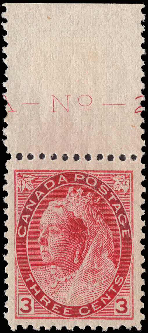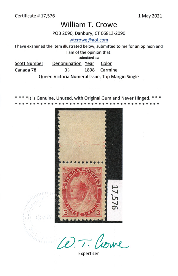 7658 og 78 image1898, Queen Victoria "Numeral", 3¢ carmine (Scott 78), a choice top sheet margin single with faint plate" No. 2", wonderfully fresh and beautifully centered, Extremely Fine, with a 2021 Crowe certificate.