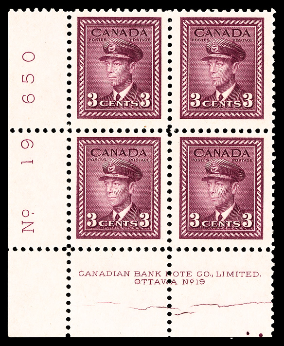 7731 nhbl 252 var. image1943, King George VI, 3¢ rose violet, cracked plate variety (Scott 252 var.), plate block of 4, o.g., never hinged, Very Fine to Extremely Fine.