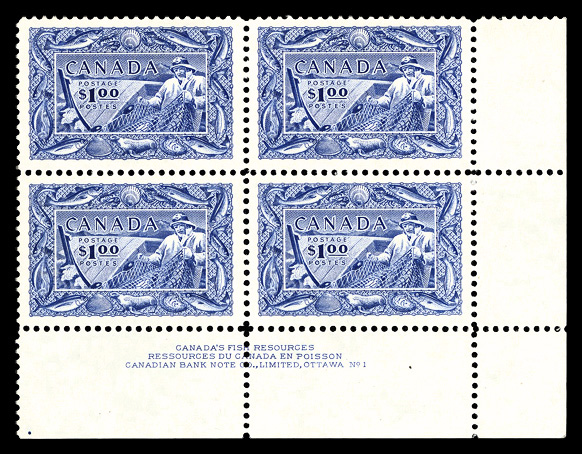 7737 nhbl 302 image1951, $1 Fisheries (Scott 302), plate block of 4, o.g., never hinged, Superb.