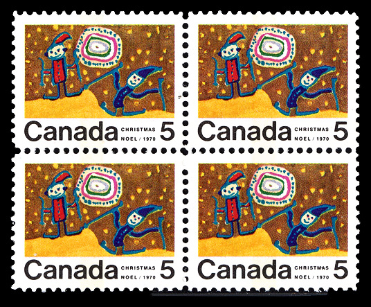 7738 nhbl 522pi image1970, 5¢ Christmas (Children Skiing), tagged (Unitrade 522pi), center block of 4, o.g., never hinged, Extremely Fine to Superb.