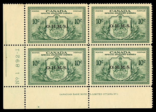 7747 nhbl EO1 imageSpecial Delivery Official, 1950, 10¢ green, "O.H.M.S." (Scott EO1), plate block of 4, o.g., never hinged, Very Fine.