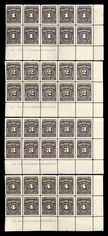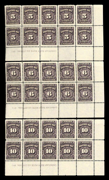 7750 nhbl J15-J20 imagePostage Dues, 1935-65, 1¢-10¢ complete (Scott J15-J20), plate block of 10, o.g., never hinged, Extremely Fine to Superb.