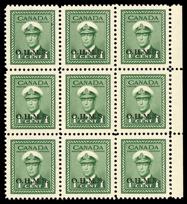 7755 nhbl O1a imageOfficial, 1949, 1¢ King George VI, "O.H.M.S." overprint, no period after "S" (Scott O1a), block of 9, variety on the center stamp., o.g., never hinged, Superb.