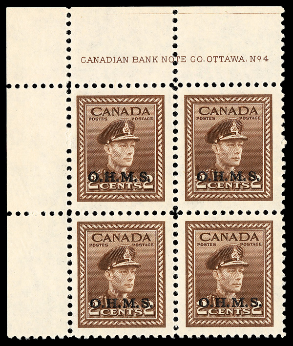7756 nhbl O2 imageOfficial, 1949, 2¢ King George VI, "O.H.M.S." overprint (Unitrade O2), UL plate block of 4 plate #4, o.g., never hinged, Extremely Fine to Superb.
