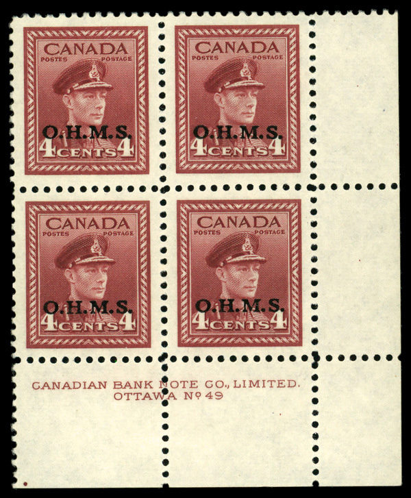 7757 nhbl O4 imageOfficial, 1949, 4¢ King George VI, "O.H.M.S." overprint (Unitrade O4), LR plate block of 4 plate #49, o.g., never hinged, Superb.