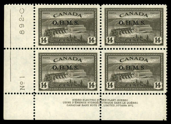 7758 nhbl O7a imageOfficial, 1949, 14¢ Hydroelectric Plant, "O.H.M.S." overprint, no period after "S" (Scott O7a), plate block of 4, variety on the LR stamp., o.g., never hinged, Extremely Fine to Superb.
