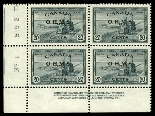 7759 nhbl O8 imageOfficial, 1949, 20¢ Combine, "O.H.M.S." overprint (Scott O8), plate block of 4, o.g., never hinged, Extremely Fine to Superb.