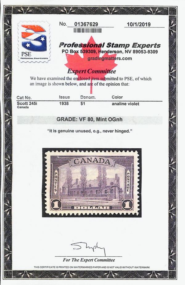 7728 nh 245 var. image1938, $1 Château de Ramezay, aniline violet (Scott 245 var.), o.g., never hinged, Post Office fresh with crisp impression on bright paper, sound with faint "pink back", Very Fine, with 2019 P.S.E. certificate graded VF 80.