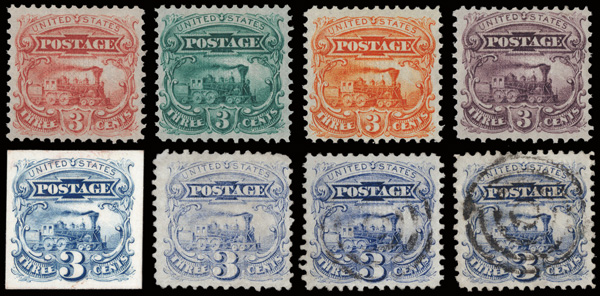 7053 og 114 etc. image3¢ Locomotive, Small specialized group (Scott 114 etc.), eight items: four different small numeral essays (114-E6d, no gum), one plate proof on card (114P$), one unused single (without gum), and two Extremely Fine used singles, Very Fine to Extremely Fine.