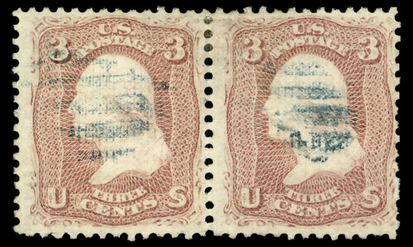 7045 O 88 image1867, 3¢ rose, E. grill (Scott 88), pair, blue cancels, Fine.