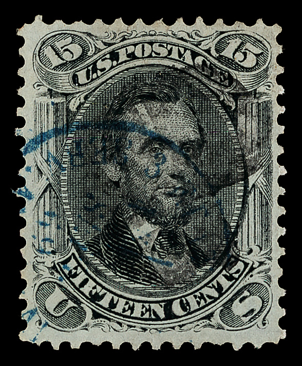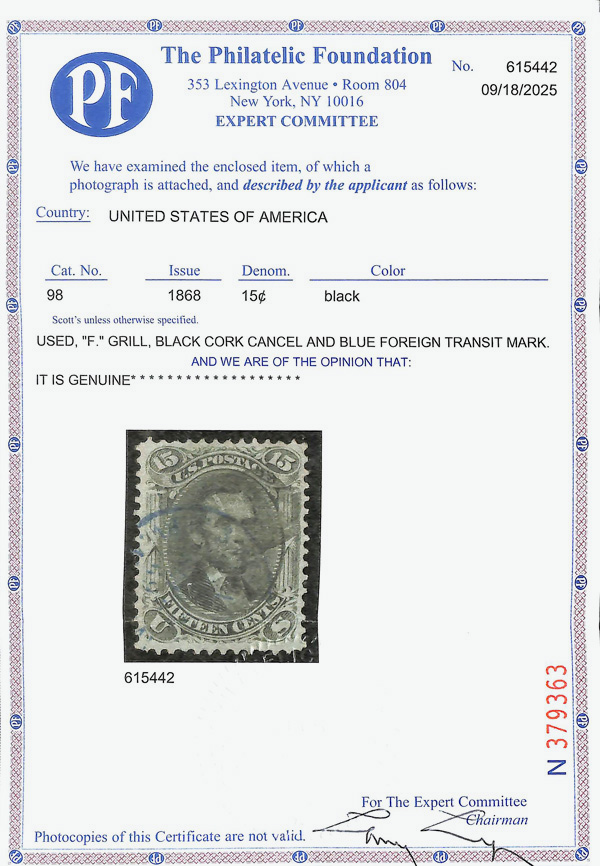 7049 O 98 image1867, 15¢ black, F. grill (Scott 98), sound with clean impression in crisp color; light black cork and partial blue foreign transit cancels, Very Fine, with 2025 P.F. certificate.