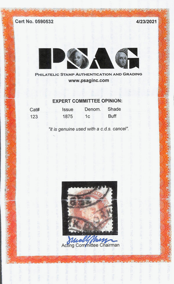 7060 O 123 image1869 (1875 Re-issue), 1¢ buff (Scott 123), sound with intense color on fresh paper, three New York double-oval cancels, nearly Very Fine, with 2021 P.S.A.G. certificate.