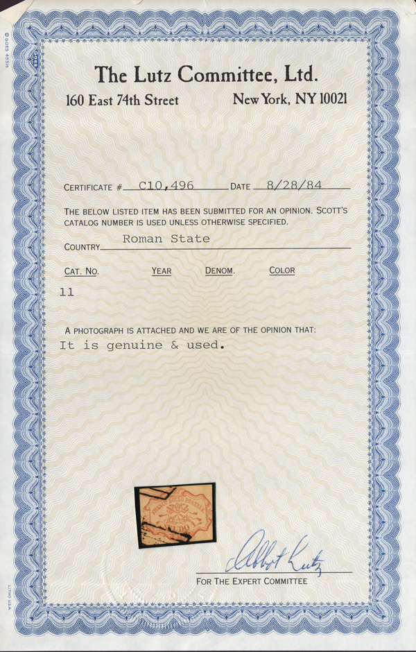 7830 O 11 image1852, 1sc rose (Scott 11), three good margins, but barely shaved at the right, neat lozenge cancels, almost Very Fine, with 1984 Lutz Committee certificate.