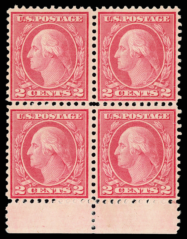 7286 nhbl 546 image1921, 2¢ carmine rose, type III, rotary press coil waste, perf. 11 (Scott 546), bottom margin block of 4, o.g., never hinged, Post Office fresh with strong color and crisp lines, sound, Fine to Very Fine.