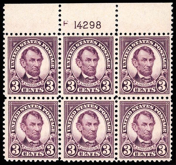 7296 ogbl 555 image1923, 3¢ Lincoln (Scott 555), top margin plate number F14298 block of 6, Post Office fresh with crisp detail in attractive color; no sign of hinge, but slight gum disturbance position 2, nearly Very Fine.