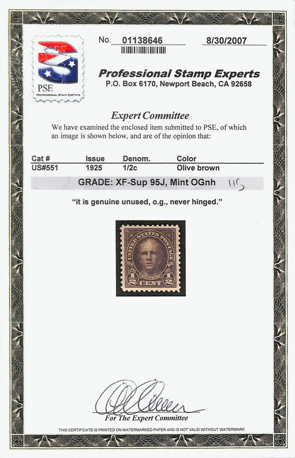 7289 nh 551 image1925, ½¢ Nathan Hale (Scott 551), clean design, oversized layout, o.g., never hinged, Extremely Fine to Superb, with 2007 P.S.E. certificate graded XF-SUP 95J.