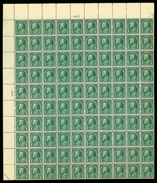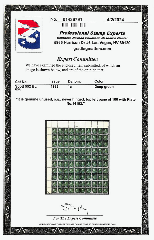 7291 nhbl 552 image1923, 1¢ Franklin (Scott 552), top left full pane of 100 with plate number 14193, o.g., never hinged, clean with intense color and sharp detail, sound, Fine to Very Fine, with 2024 P.S.E. certificate.