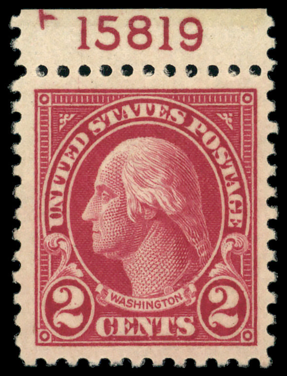 7294 nh 554 image1923, 2¢ Washington (Scott 554), plate number single, o.g., never hinged, jumbo margin, Very Fine to Extremely Fine. (Image) Suggested Bid $64