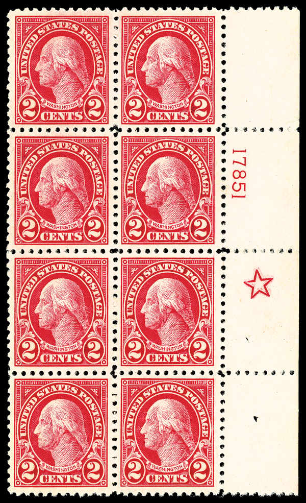 7295 nhbl 554 image1923, 2¢ Washington (Scott 554), right margin plate block of 8 with five point star, Pleasing margin balance, o.g., never hinged, Extremely Fine.