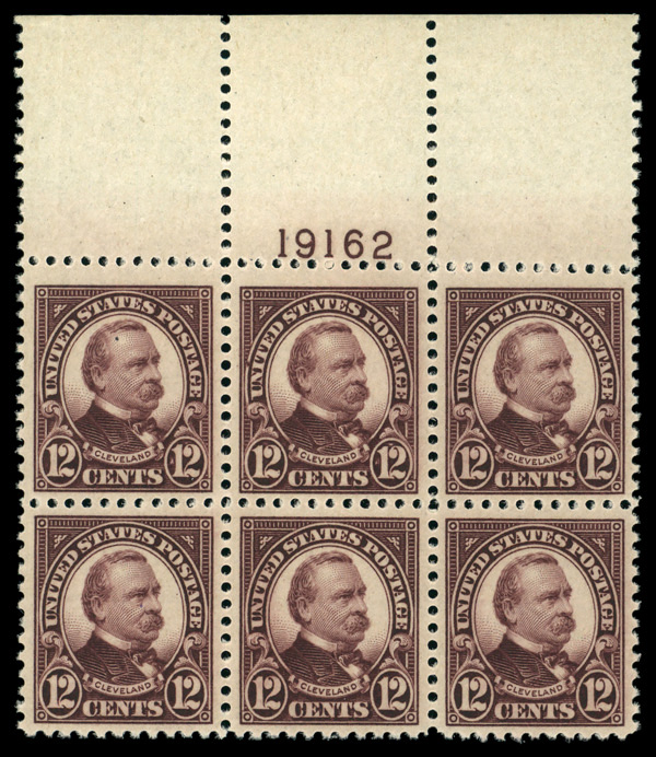 7304 nhbl 564 image1923, 12¢ Grover Cleveland (Scott 564), plate block of 6, o.g., never hinged, Very Fine to Extremely Fine.