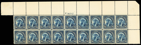 7305 nhbl 565 image1923, 14¢ American Indian (Scott 565), top margin plate number F14512 block of 18, o.g., never hinged, attractive multiple with bold color and fresh paper, the left-most two stamps removed (and selvage tab previously folded under), Fine to Very Fine.
