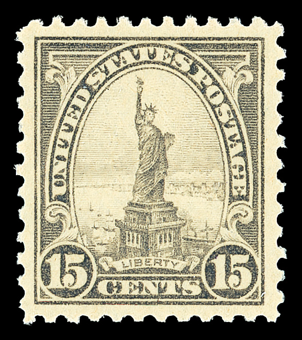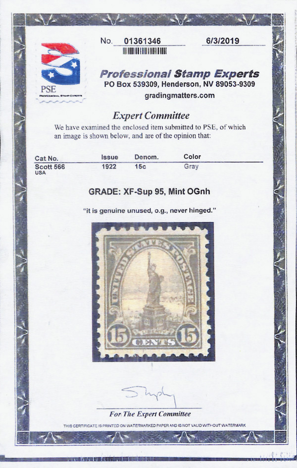 7306 nh 566 image1922, 15¢ Statue of Liberty (Scott 566), o.g., never hinged, pristine with clean color and impression, wonderfully centered and sound, Extremely Fine to Superb, with photocopy of 2019 P.S.E. certificate graded XF-SUP 95.