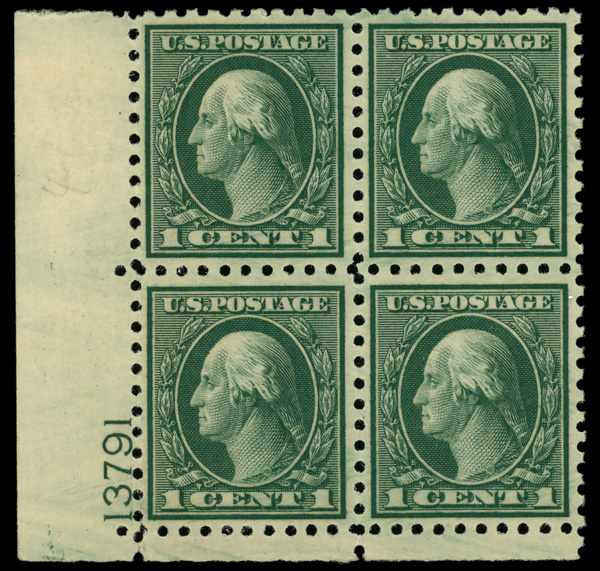7285 nhbl 543 image1921, 1¢ green, rotary press coil waste, perf. 10 (Scott 543), plate block of 4, o.g., never hinged, Very Fine to Extremely Fine.