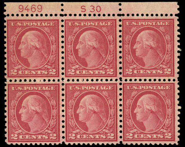 7283 nhbl 540 image1919, 2¢ carmine rose, type II, rotary press coil waste, perf. 11 x 10 (Scott 540), plate block of 6 & 'S 30', o.g., never hinged, Fine.