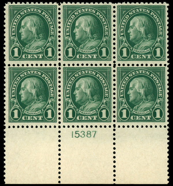 7292 nhbl 552 image1923, 1¢ Franklin (Scott 552), plate block of 6, o.g., never hinged, Very Fine to Extremely Fine.