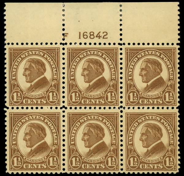 7293 nh/ogbl 553 image1925, 1½¢ Harding (Scott 553), plate block of 6, o.g., stamps never hinged, hinged in selvage only, Fine to Very Fine.