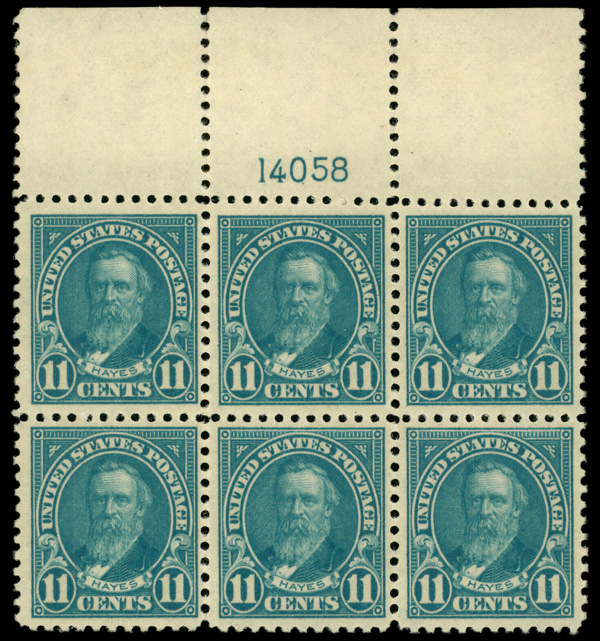 7303 nhbl 563 image1922, 11¢ Hayes (Scott 563), plate block of 6, o.g., never hinged, Very Fine to Extremely Fine.