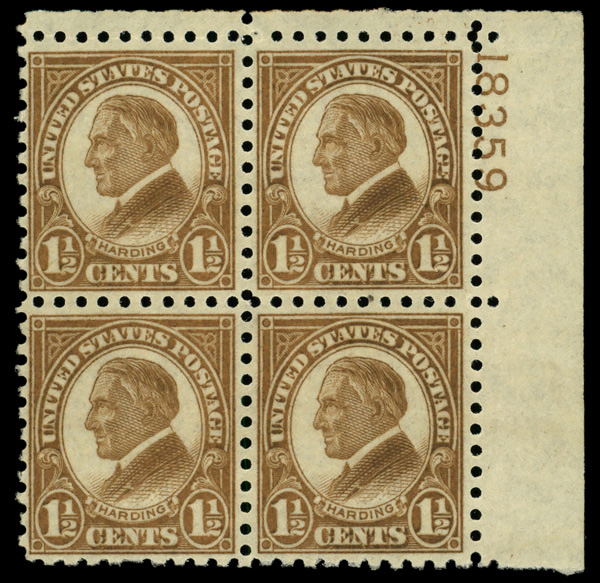 7317 nhbl 582 image1925, 1½¢ Harding, rotary press printing, perf. 10 (Scott 582), plate block of 4, o.g., never hinged, Fine.