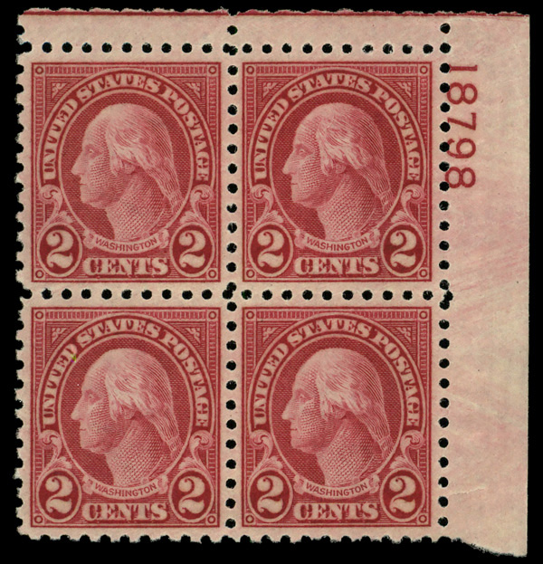 7318 nhbl 583 image1924, 2¢ Washington, rotary press printing, perf. 10 (Scott 583), plate block of 4, o.g., never hinged, Extremely Fine.