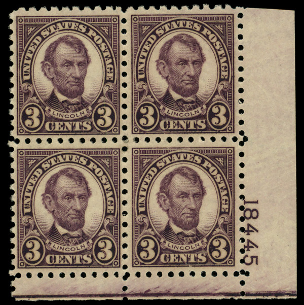 7320 nhbl 584 image1925, 3¢ Lincoln, rotary press printing, perf. 10 (Scott 584), plate block of 4, o.g., never hinged, Very Fine.