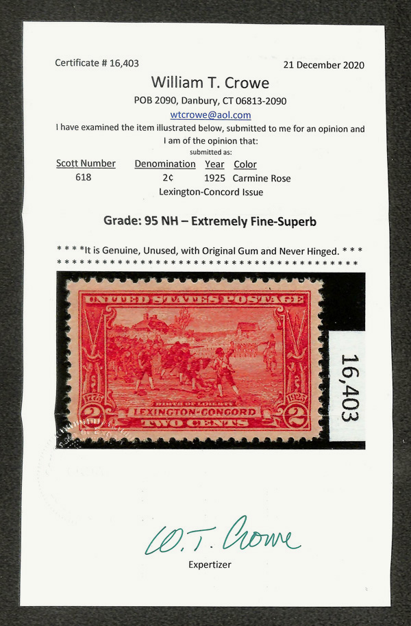 7338 nh 618 image1925, 2¢ Lexington-Concord (Scott 618), o.g., never hinged, Extremely Fine to Superb, with 2020 Crowe certificate graded XF-SUP 95.