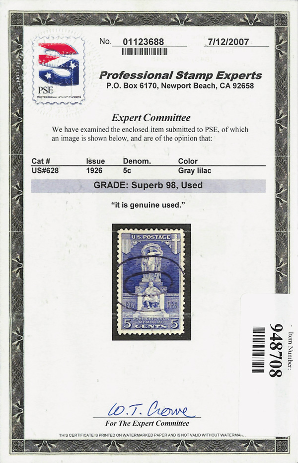 7347 O 628 image1926, 5¢ Ericsson (Scott 628), Superb, with 2007 P.S.E. certificate graded SUP 98.