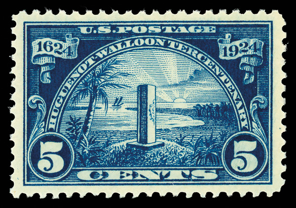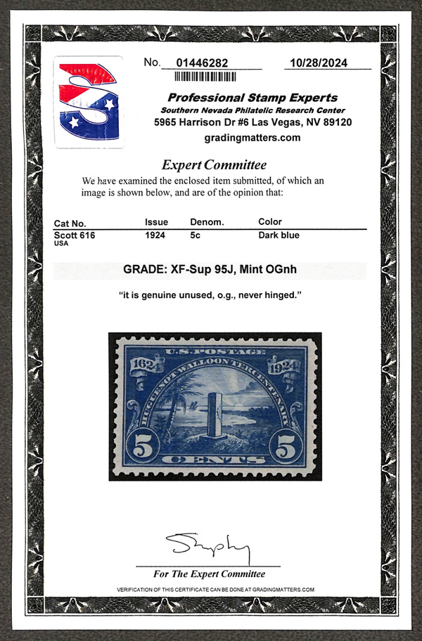 7336 nh 616 image1924, 5¢ Huguenot-Walloon (Scott 616), Crisp, clear definition, o.g., never hinged, Extremely Fine to Superb, with 2024 P.S.E. certificate graded XF-SUP 95J.