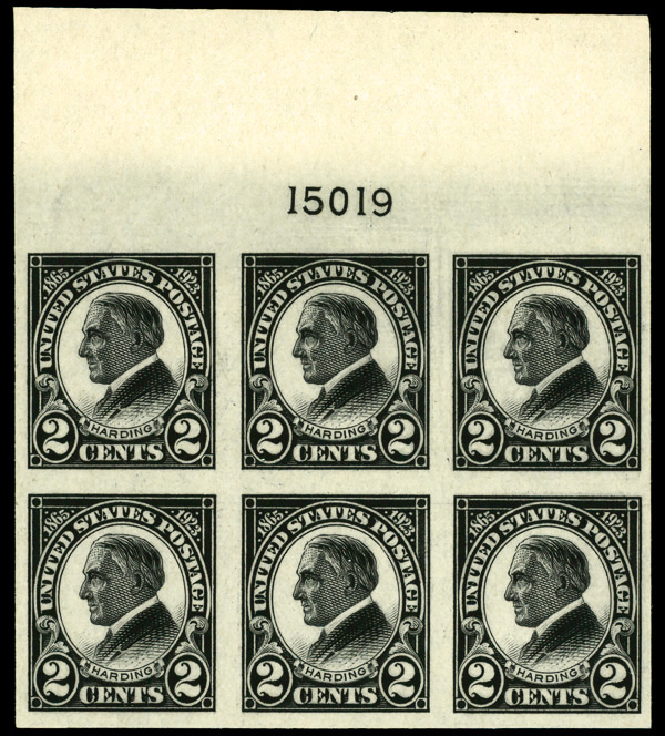 7333 nhbl 611 image1923, 2¢ Harding, imperf. (Scott 611), plate block of 6, o.g., never hinged, Very Fine to Extremely Fine.