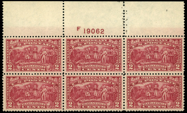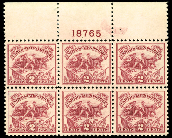 7356 nhbl 645 image1928, 2¢ Valley Forge (Scott 645), top margin F plate block of 6, Deep full-bodied color, o.g., never hinged, Very Fine.