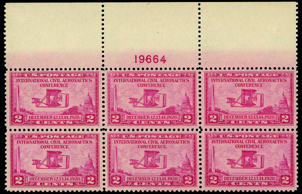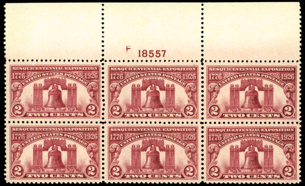 7346 nhbl 627 image1926, 2¢ Sesquicentennial Exposition (Scott 627), plate block of 6, o.g., never hinged, Extremely Fine.