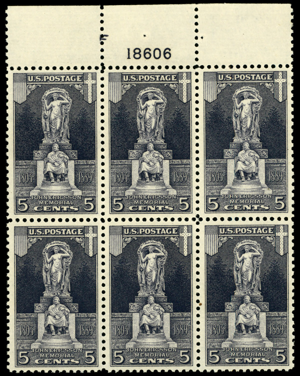 7348 nhbl 628 image1926, 5¢ Ericsson (Scott 628), plate block of 6, o.g., never hinged, Extremely Fine.