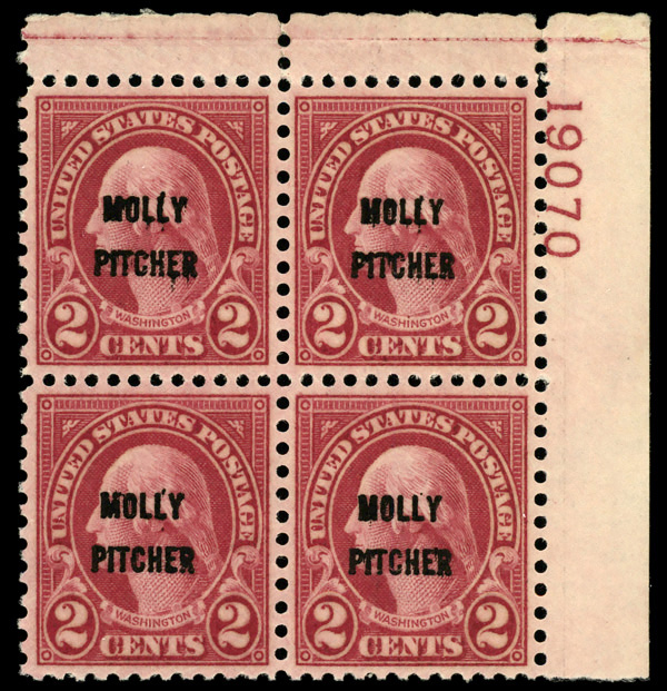 7357 nhbl 646 image1928, 2¢ Molly Pitcher (Scott 646), plate block of 4, o.g., never hinged, Extremely Fine.