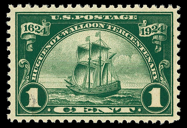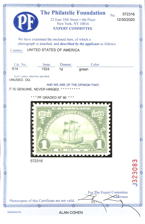 7335 nh 614 image1924, 1¢ Huguenot-Walloon (Scott 614), o.g., never hinged, Extremely Fine, with 2020 P.F. certificate graded XF 90.