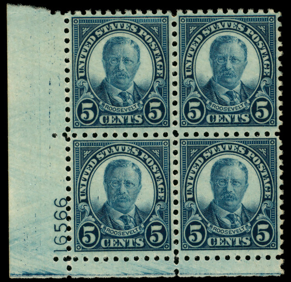 7323 nhbl 586 image1924, 5¢ Roosevelt, rotary press printing, perf. 10 (Scott 586), plate block of 4, o.g., never hinged, Fine to Very Fine.