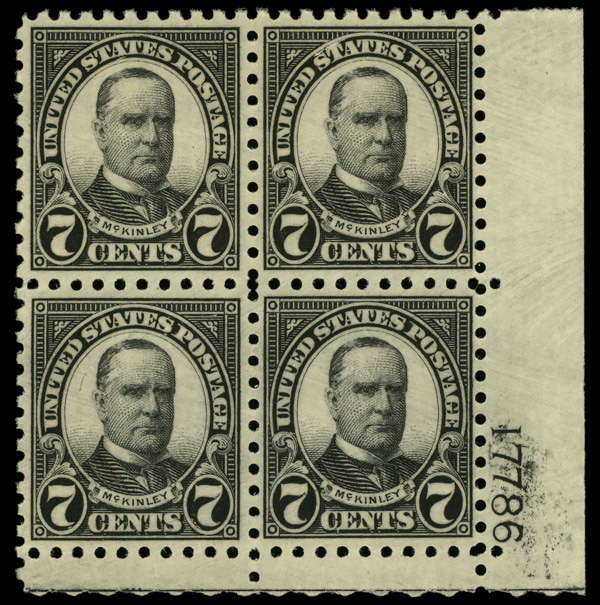 7326 nhbl 588 image1926, 7¢ McKinley, rotary press printing, perf. 10 (Scott 588), plate block of 4, o.g., never hinged, Fine to Very Fine.