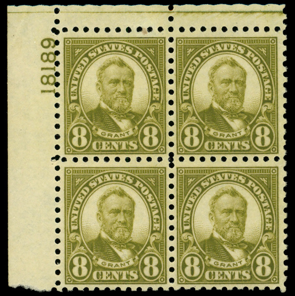 7328 nhbl 589 image1926, 8¢ Grant, rotary press printing, perf. 10 (Scott 589), plate block of 4, o.g., never hinged, Fine to Very Fine.