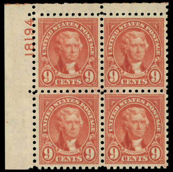 7330 nhbl 590 image1926, 9¢ Jefferson, rotary press printing, perf. 10 (Scott 590), plate block of 4, o.g., never hinged, Extremely Fine.